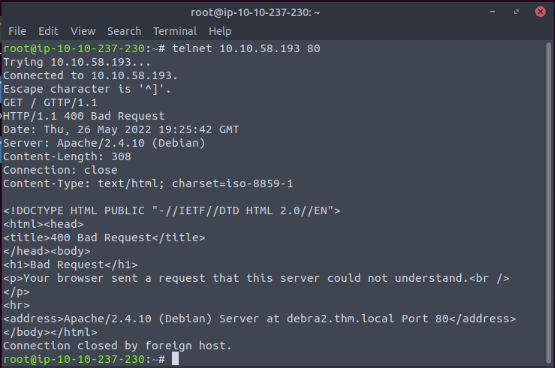 Start the attached VM from Task 3 if it is not already started. On the AttackBox, open the terminal and use the telnet client to connect to the VM on port 80. What is the name of the running server?
