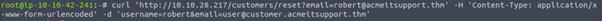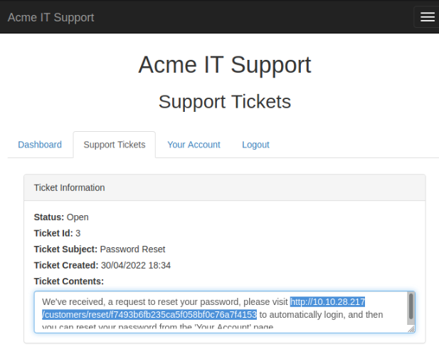 Now rerunning Curl Request 2 but with our @acmeitsupport.thm in the email field you'll have a ticket created on your account which contains a link to log you in as Robert. Using Robert's account, you can view their support tickets and reveal a flag.