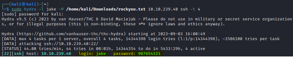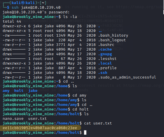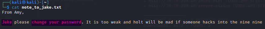 Amy says that Jake's password is weak. there is no page is found in the dirb scan so ssh connection can be bruteforced with the username jake