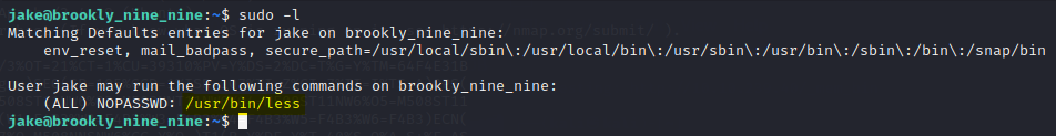 As in the first solution, we find the way to be root by using the sudo -l command.