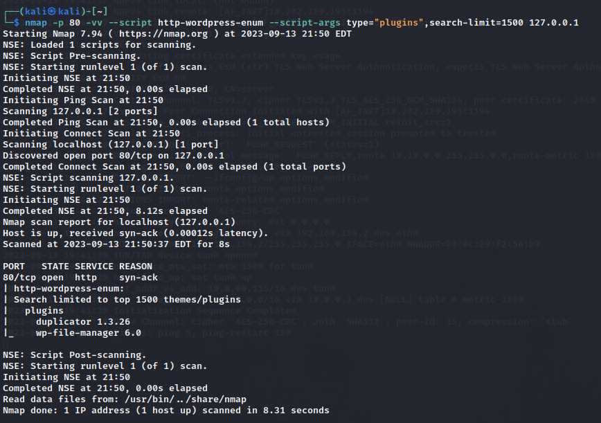 We can see two vulnerabilities in the nmap scan we made with the script. 1: duplicator 1.3.26 2: wp-file-manager 6.0