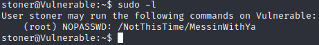 when we run "sudo -l" we get "/NotThisTime/MessinWithYa"....