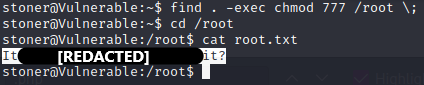 In the list there is find commnad which have SUID bit set which means we can run find as root user. Using -exec flag as shown above. Let’s try out by changing the permission of root directory.