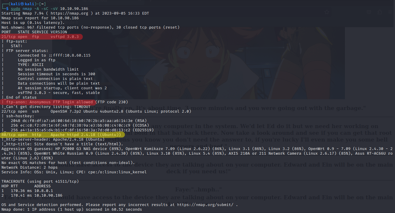 The nmap output shows that http is running on port 80 and ftp service is running on port 22. Also, anonymous login is enabled on the ftp port.