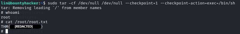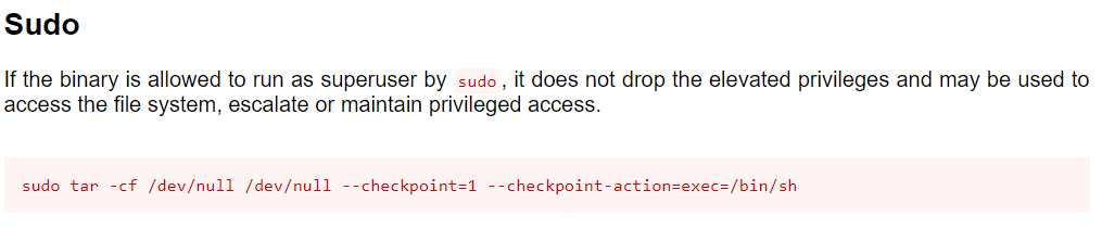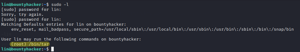 Here we see that we can run the /bin/tar command as "lin". There is a command that exploits this vulnerability on the gtfobins site.