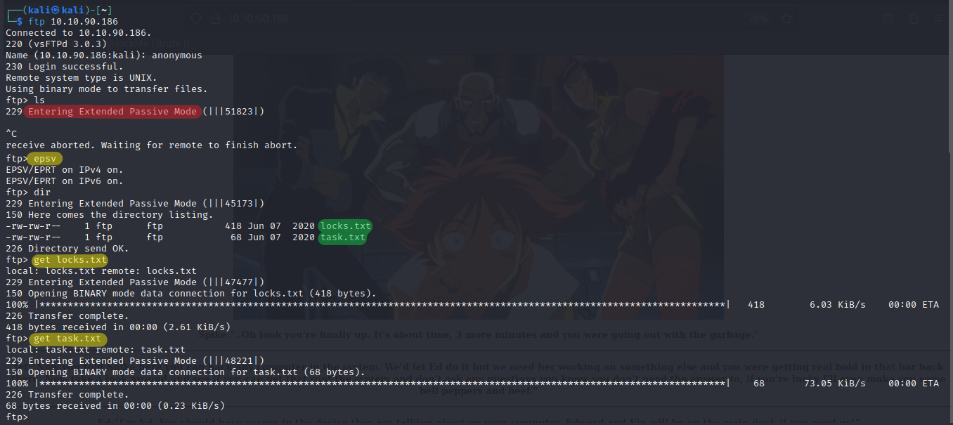 When I logged into the ftp port as Anonymous, I got an error while running the command. I solved the error with the "epsv" command.