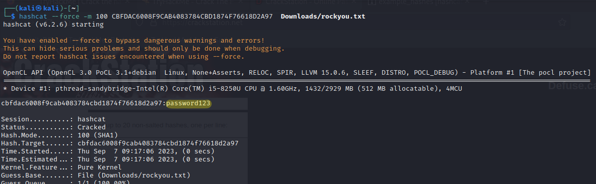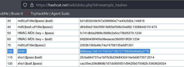 Let's find the mode value for the -m parameter of SHA1 from the internet without breaking it with Hashcat.