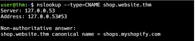 What is the CNAME of shop.website.thm?