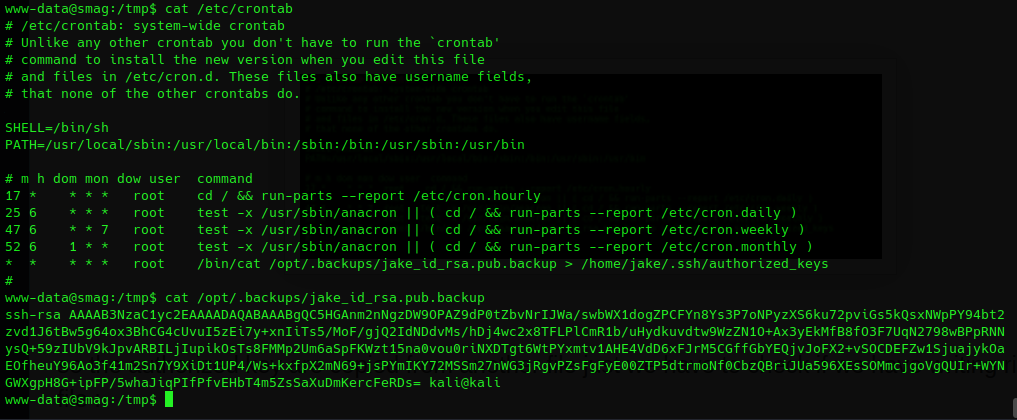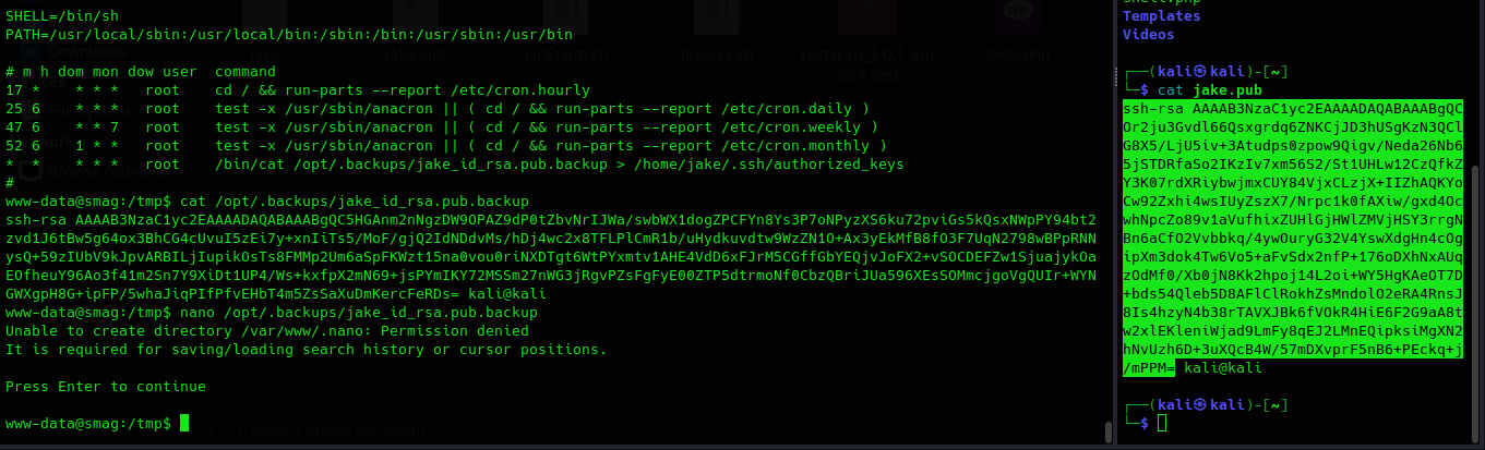 In the crontab, we can see that the id_rsa.pub file of the user jake is written to the authorized_keys file. Then let's create the id_rsa file for the jake user with ssh-keygen.