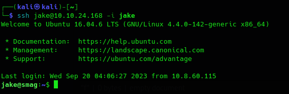 After waiting for 1-2 minutes, we can log in as jake user with the id_rsa we created.