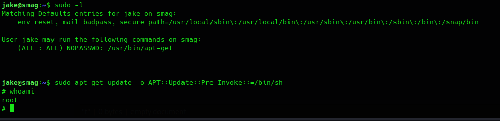 When we search the sudo -l command output with gtfo bins, we see that we can become root in a single line command.