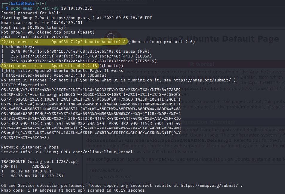 The home page of the website is the Apache setup page. So let's go directly to file scanning with dirb.