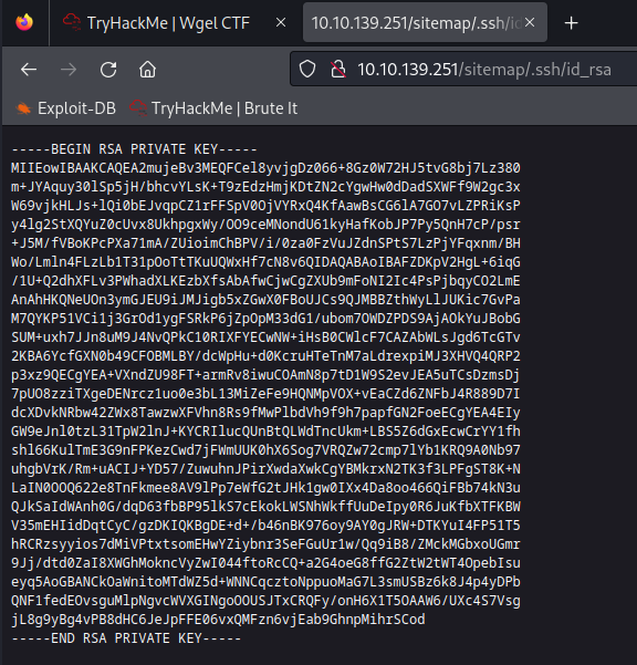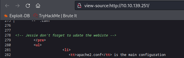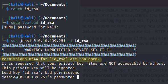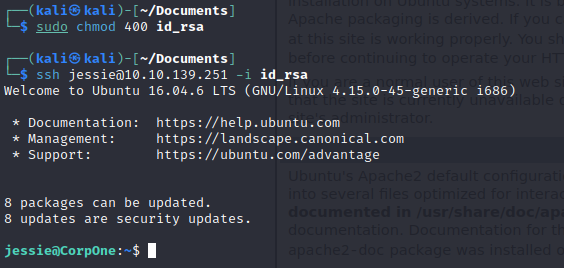 we have the /.ssh RSA key. Then we need a username. While browsing the site, we come across the name "jessie" in the source code of the Apache homepage.